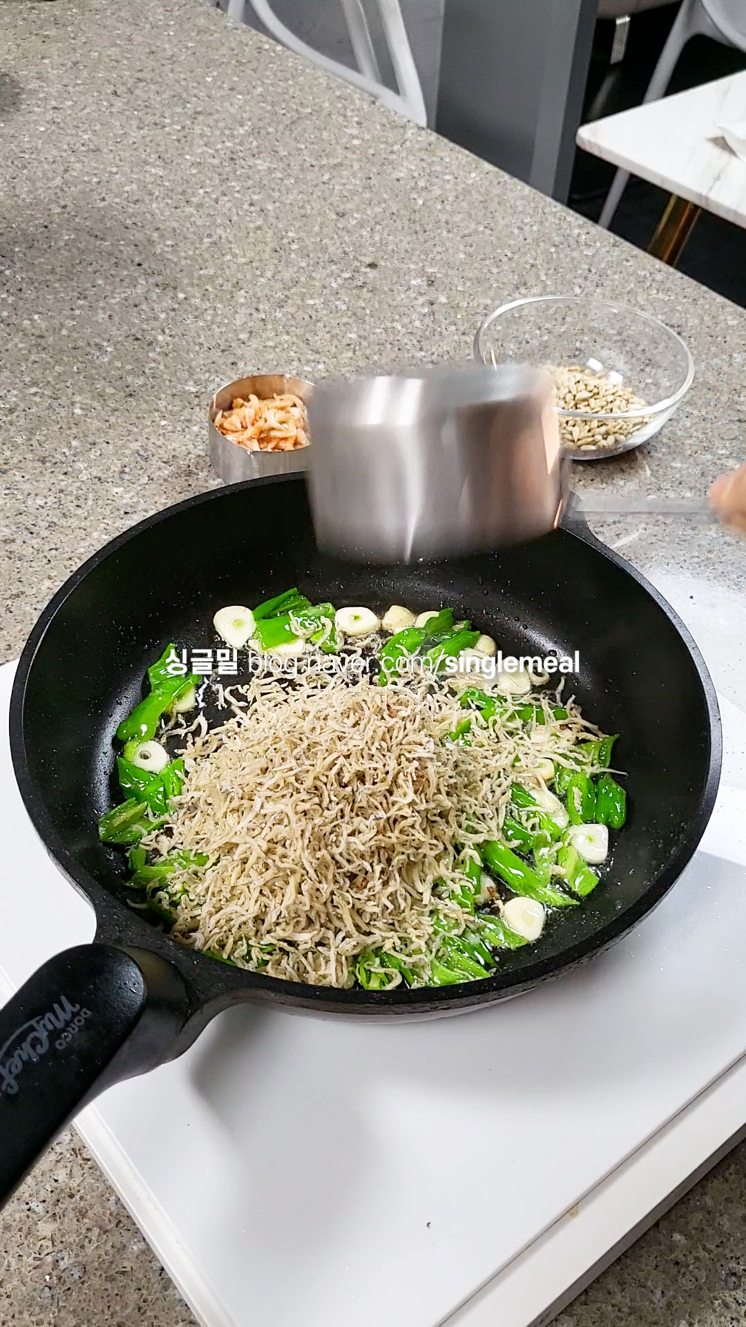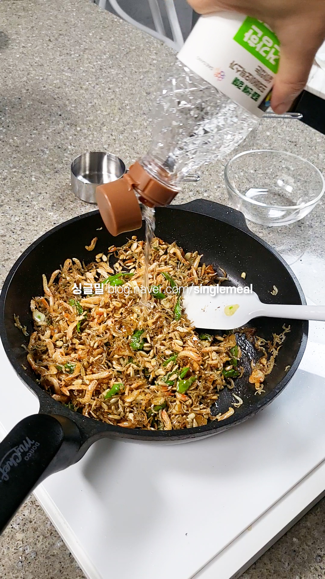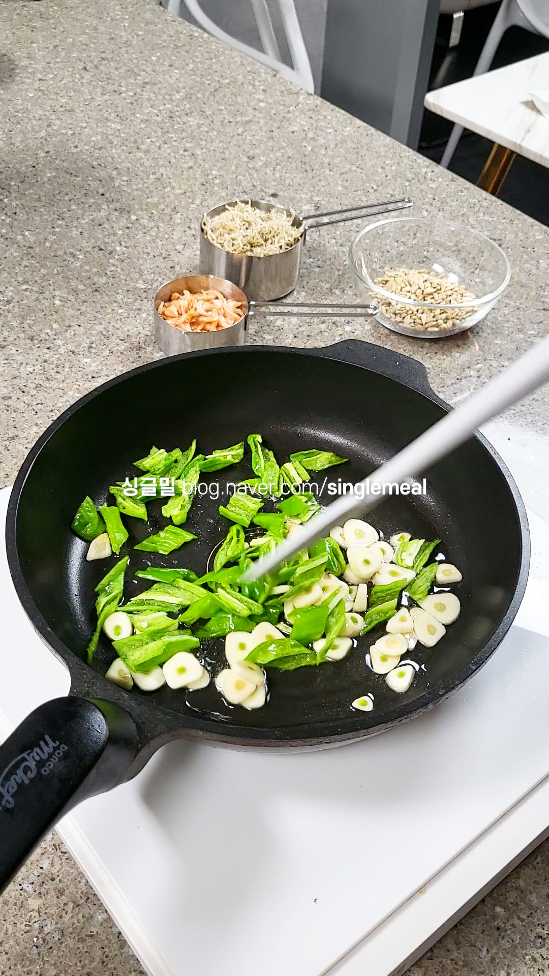 이 과정은 마늘과 꽈리고추 향이 기름에 잘 밸 수 있도록 해주는 과정이랍니다 :)
