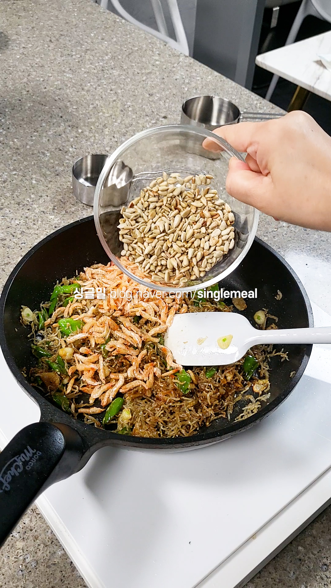 추가로 보리새우와 아까 볶아 놓은 해바라기씨를 함께 넣습니다.
