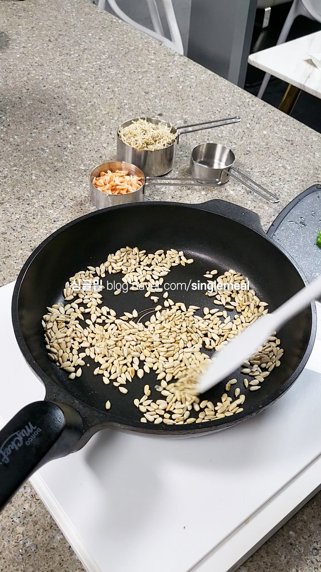아무것도 두르지 않은 팬에서 해바라기씨부터 노릇하게 볶아준 다음 잠시 덜어둡니다.