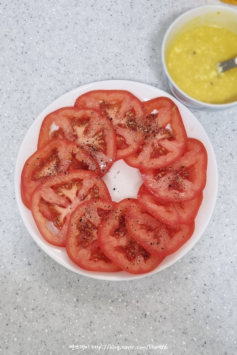 이번에 토마토를 얇게 저미듯 썰어서 핑크솔트+후추로 밑간해줬어요