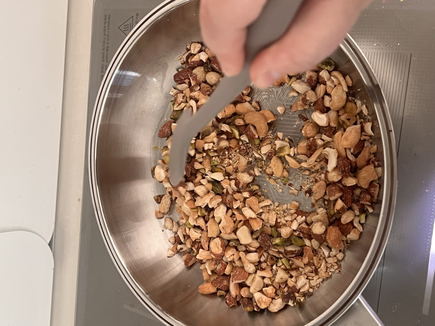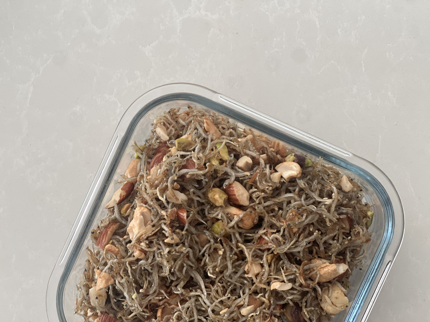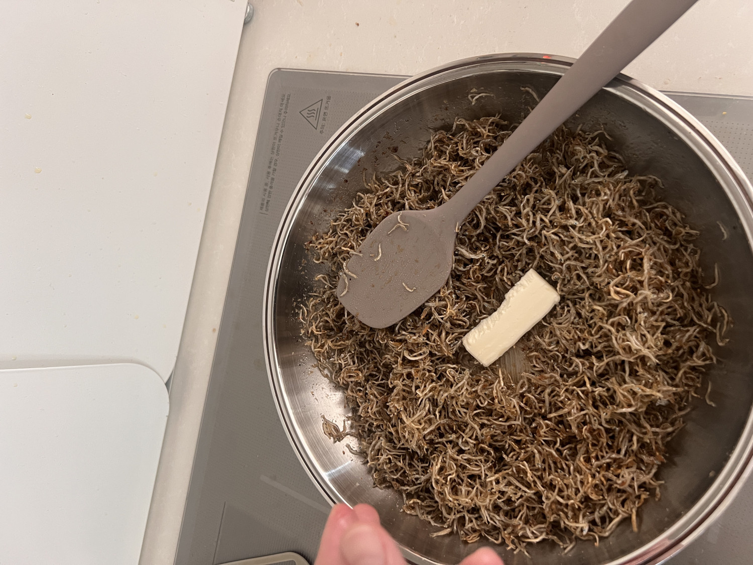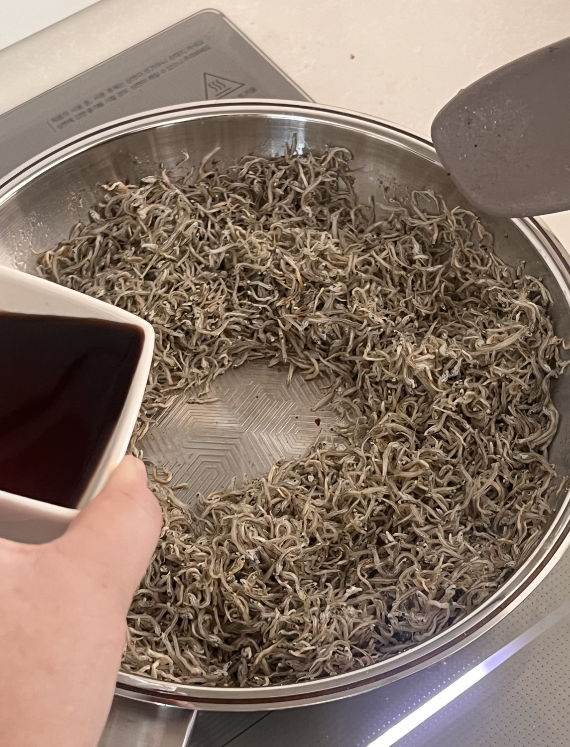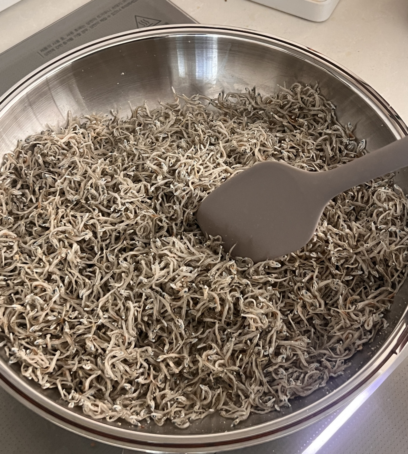 멸치가 하얗게 되고 비린내 사라질 때까지 볶아주세요. 체에 살짝 털어 잔가루 제거(선택)