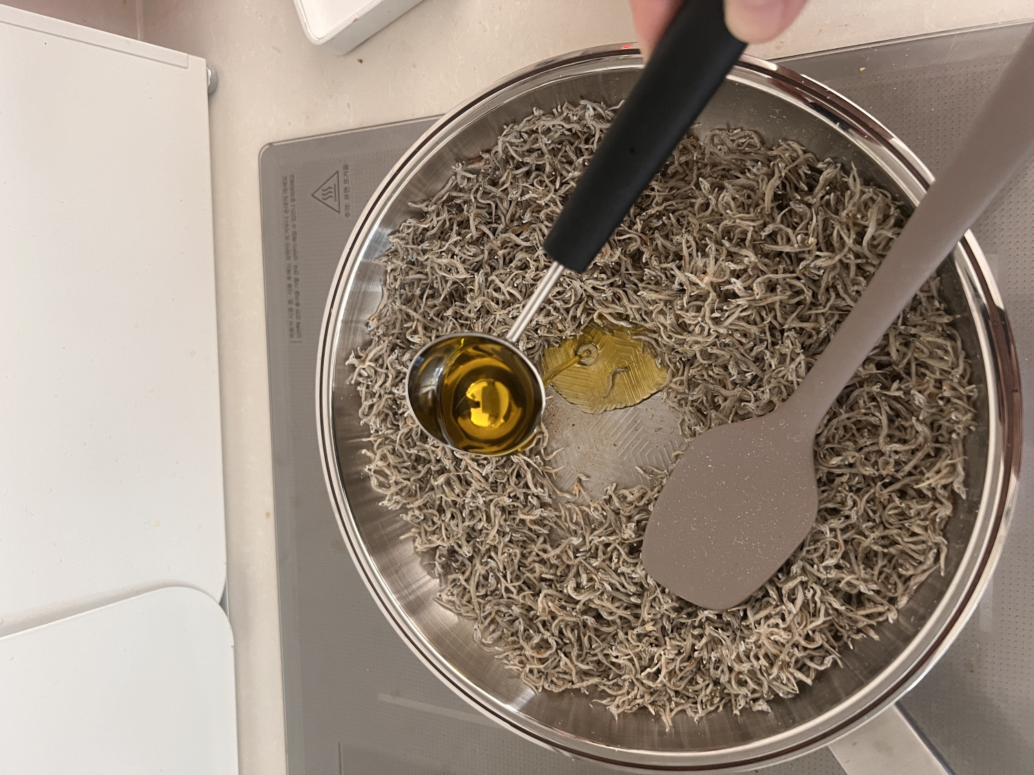 마른 볶음 후에 기름을 넣어야 멸치가 눅눅해지지 않고 비린내도 없어요.