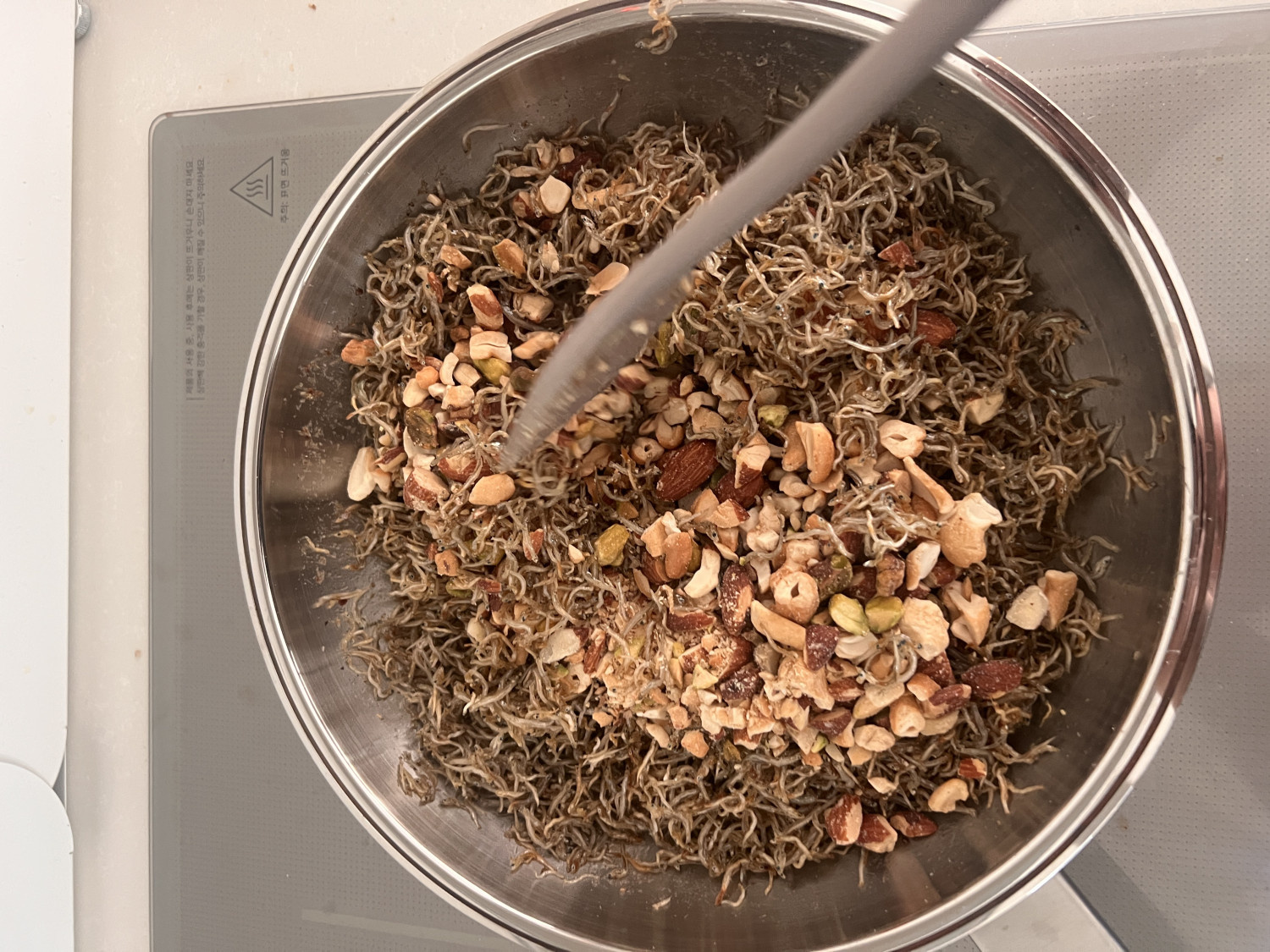 미리 섞어 넣어주어야 멸치가 눅눅해지지 않아요.