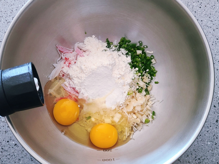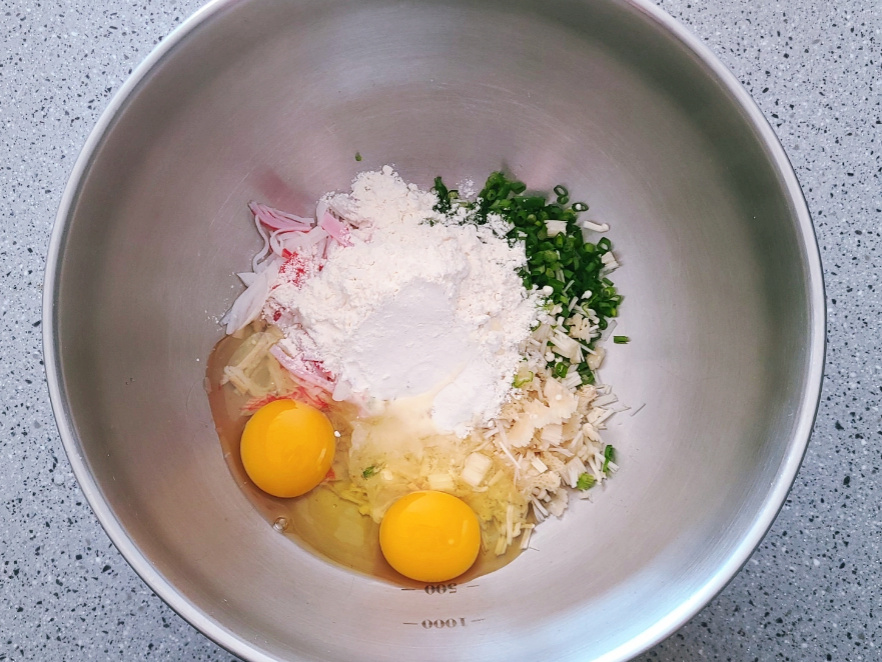 준비한 팽이버섯, 크래미, 쪽파를 볼에 담은 다음에 부침가루 3큰술, 계란 2개를 넣고
