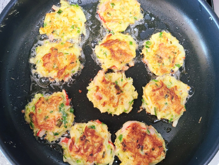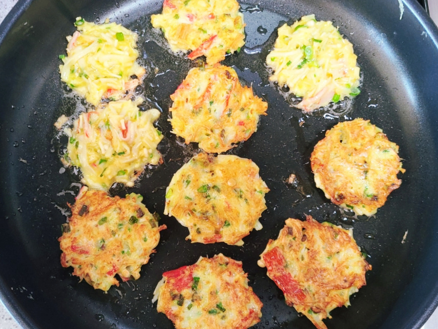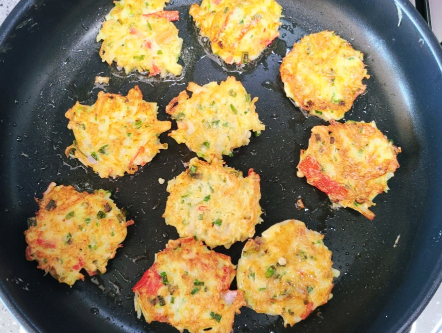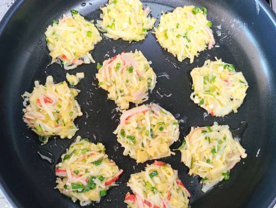 뒤집어서 조금 더 부쳐주다가 하나를 살짝 들어보고 앞뒤로 노릇하게 부쳐졌으면 가스불을 끄고 마무리를 하면 크래미 팽이버섯전 레시피 완성입니다.