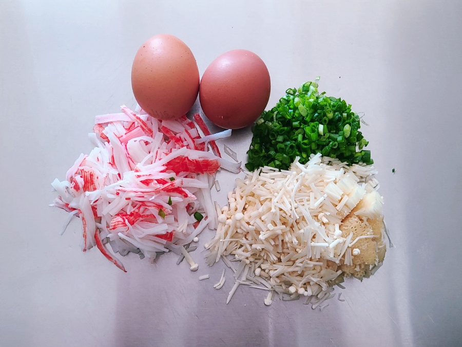 팽이버섯은 밑동 윗쪽을 자른 다음에 1~1.5cm 정도 길이로 자르고, 쪽파는 송송 썰고, 크래미는 손이나 포크로 이용하여 찢은 다음에 길이가 길면 2~3등분으로 잘라서 준비하면 되세요.