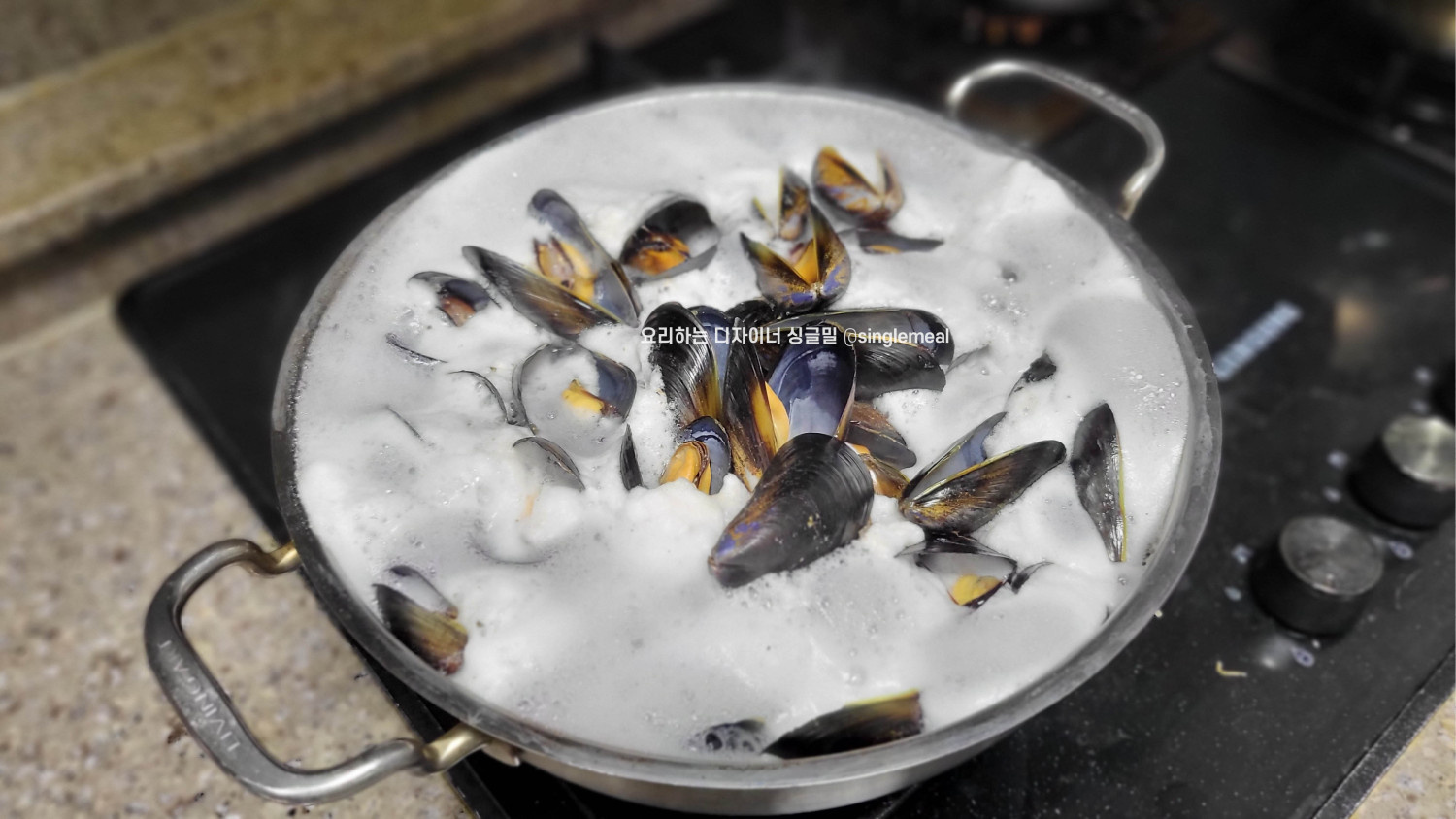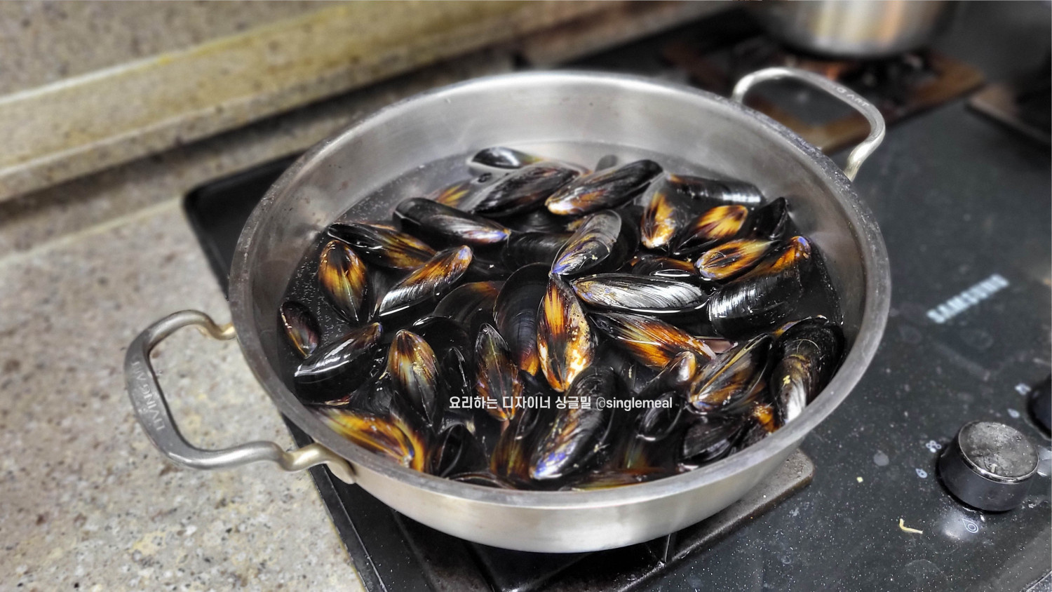 큰 냄비에 홍합이 잠길 정도의 물을 부어 10~15분 삶아줍니다.