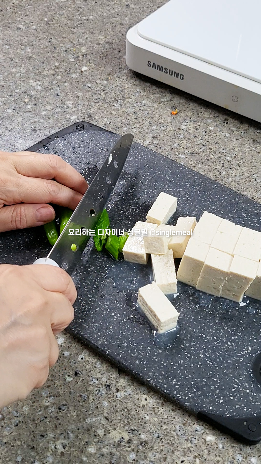 두부도 원하는 크기로 썰고, 살짝 매콤한 꽈리고추도 어슷썰어 준비했어요.