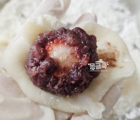 찹쌀 반죽을 펴 팥앙금 딸기볼을 올리고,