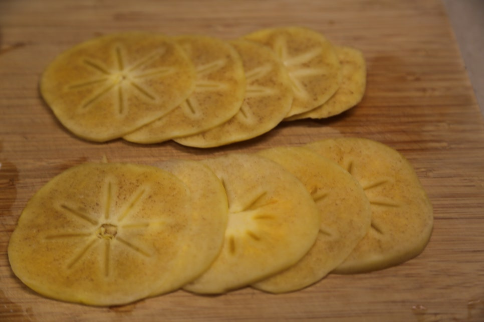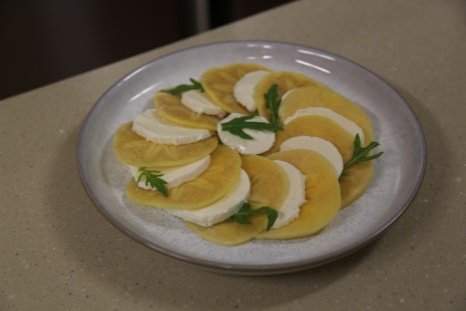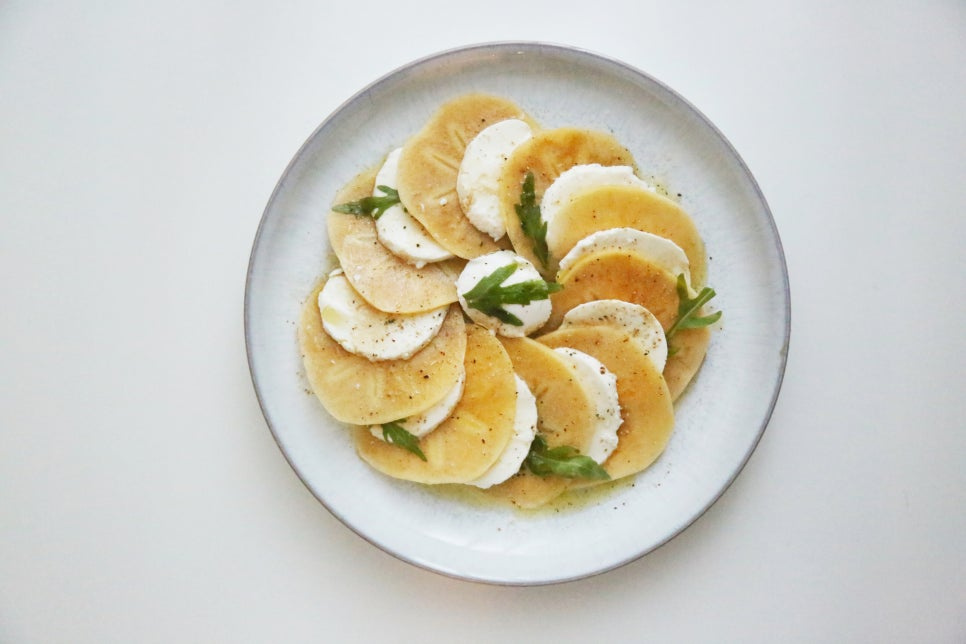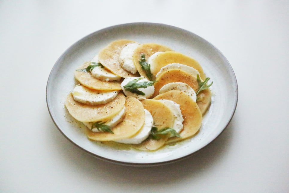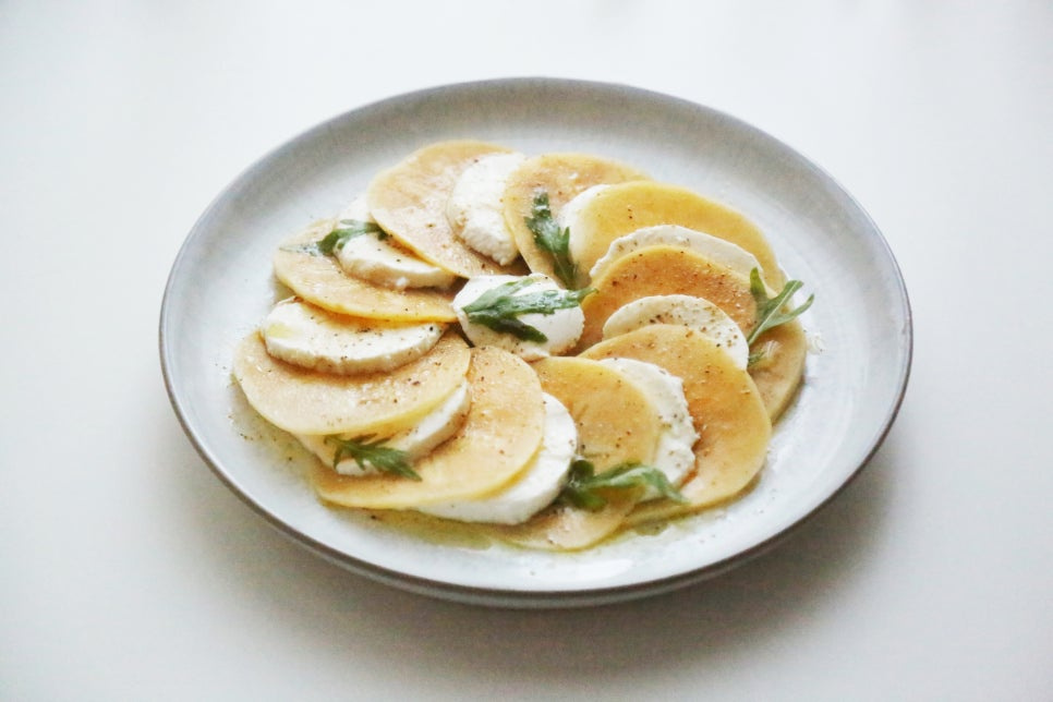 썰은 단감 1개, 생모짜렐라치즈 1개, 루꼴라잎 약간