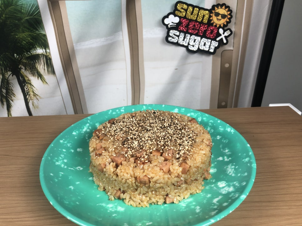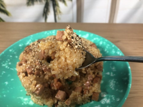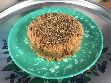 햄 300g , 밥 3공기 , 식용유 3스푼 , 물 120ml , 참기름 2스푼 , 통깨 1스푼