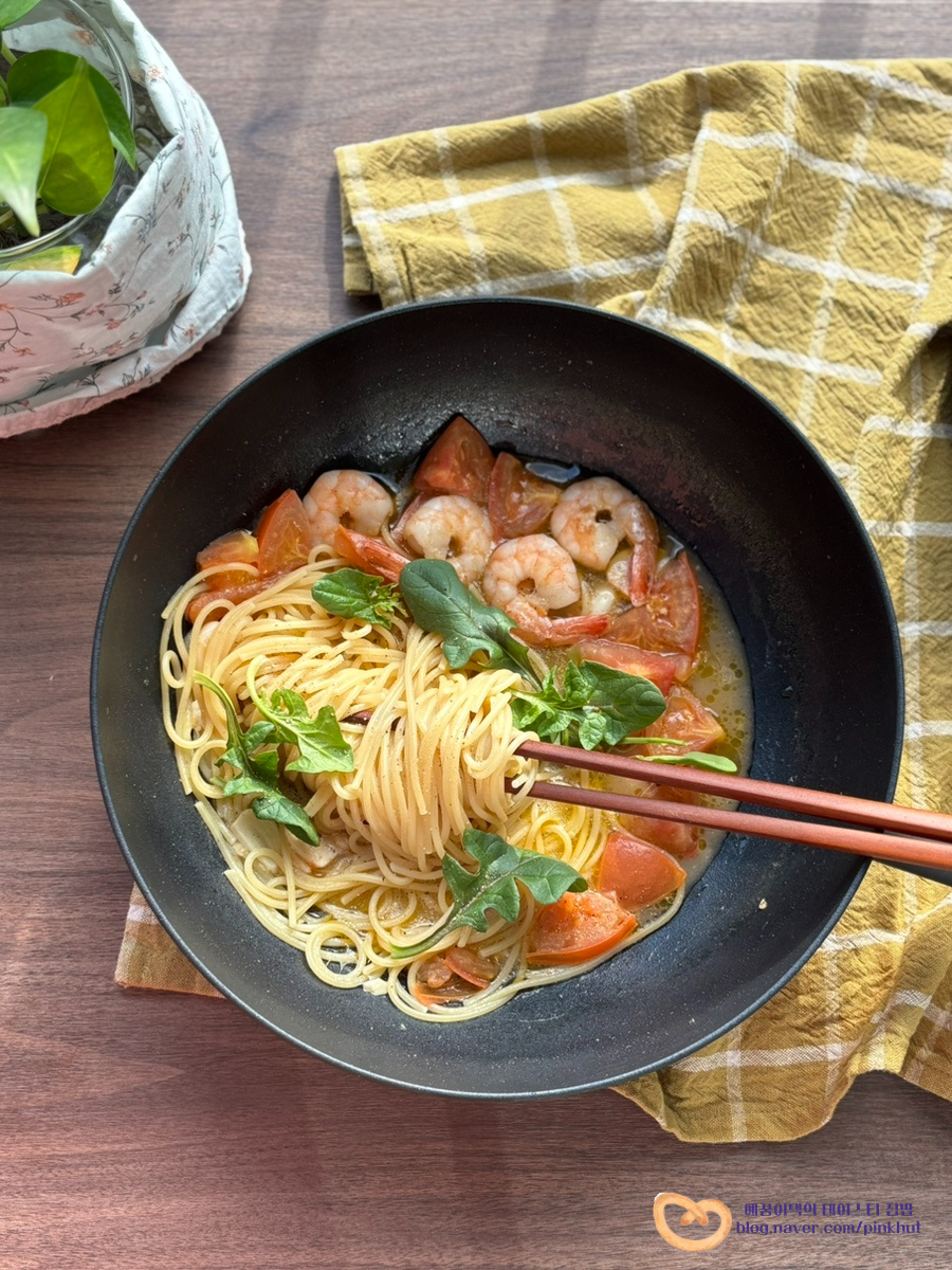 올리브오일에 마늘을 볶다가 새우, 토마토 추가해 주고요 물, 파스타면을 함께 넣어 끓여주면 알리오올리오 새우 토마토 파스타가 완성돼요.