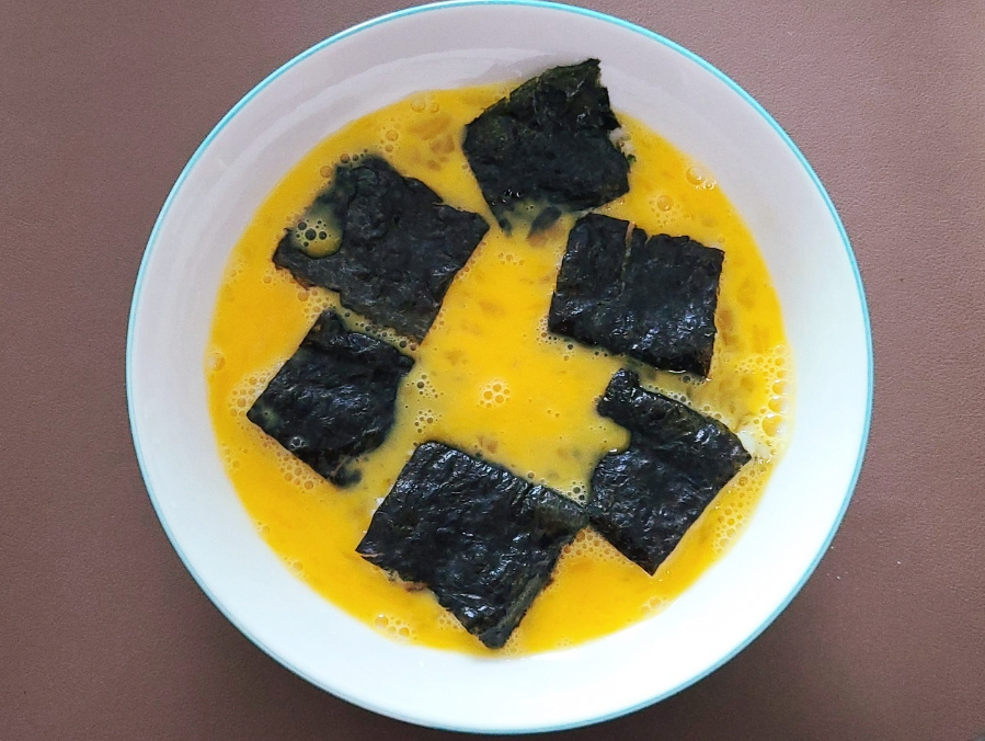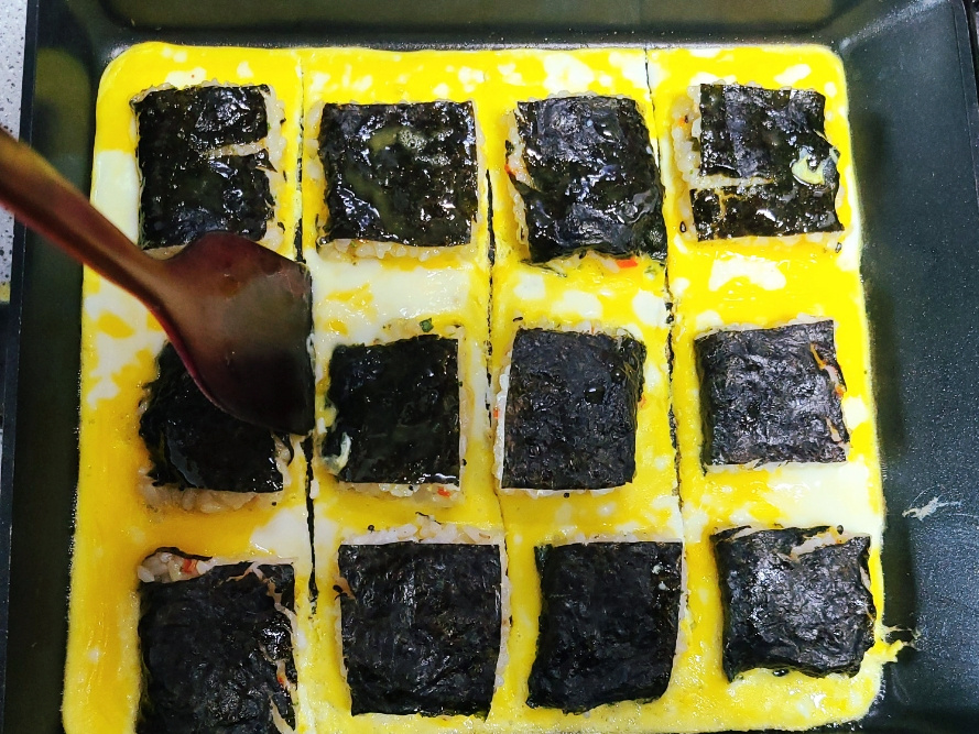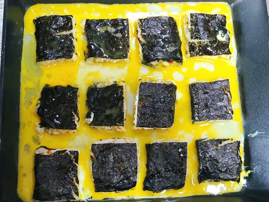 (계란물을 입힌 다음에는 빠르게 밥전을 부치는게 좋고 남은 계란물은 부어주면 되세요)