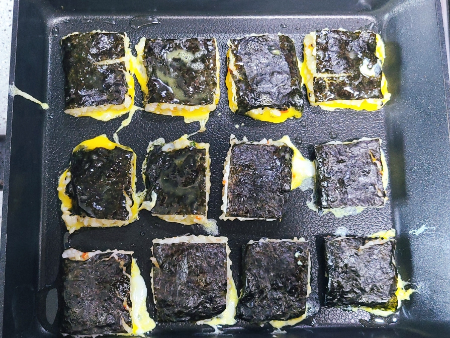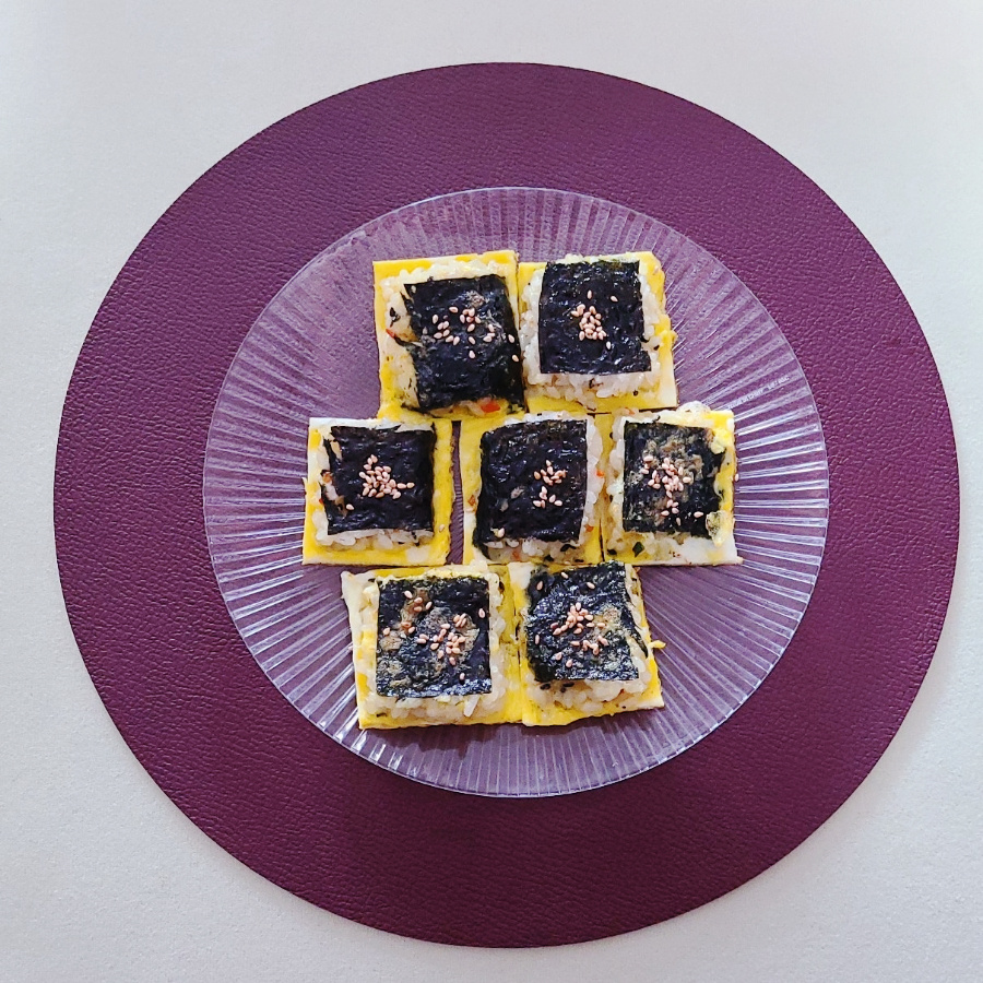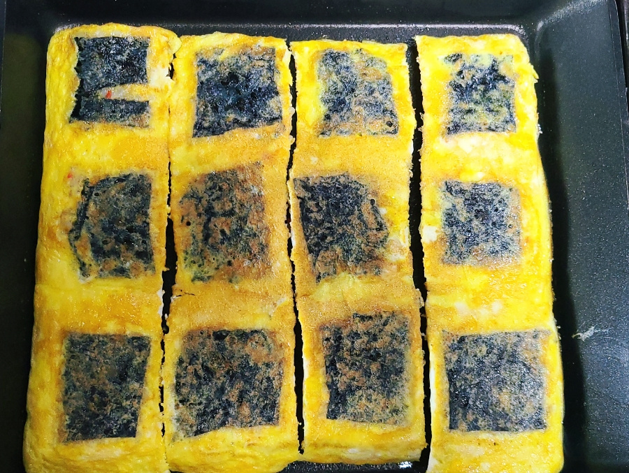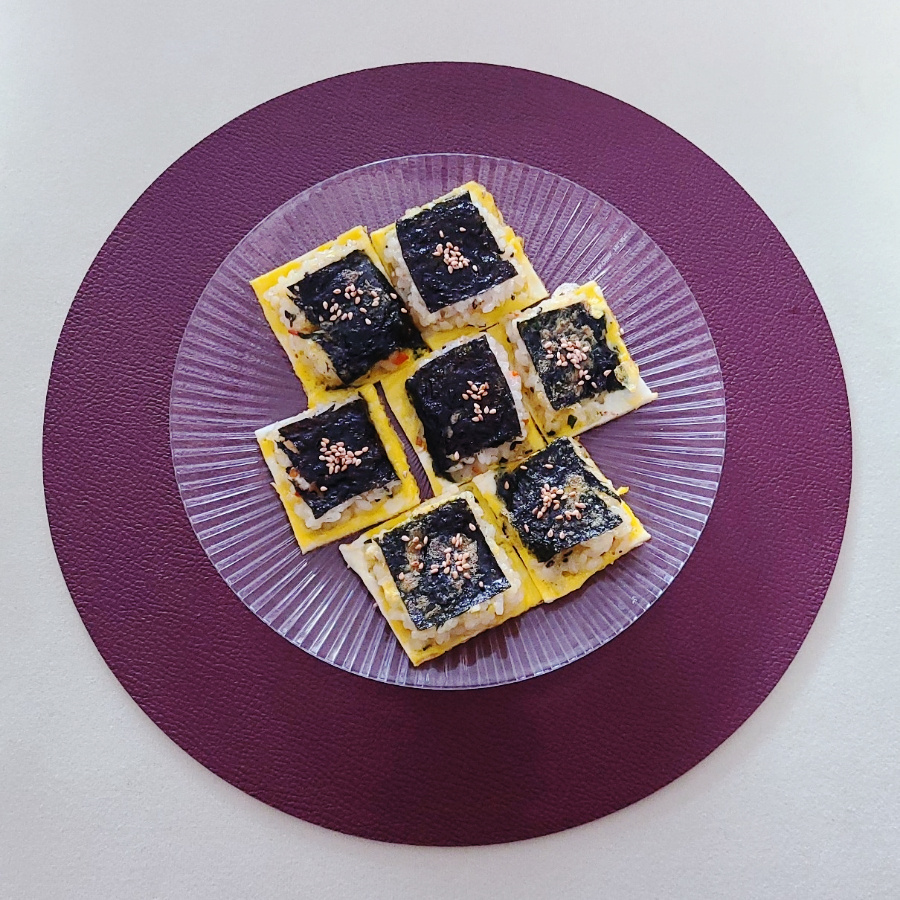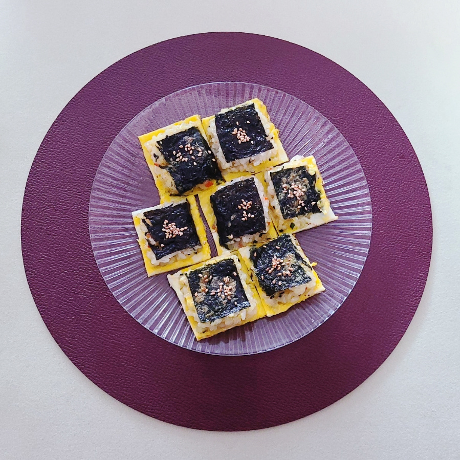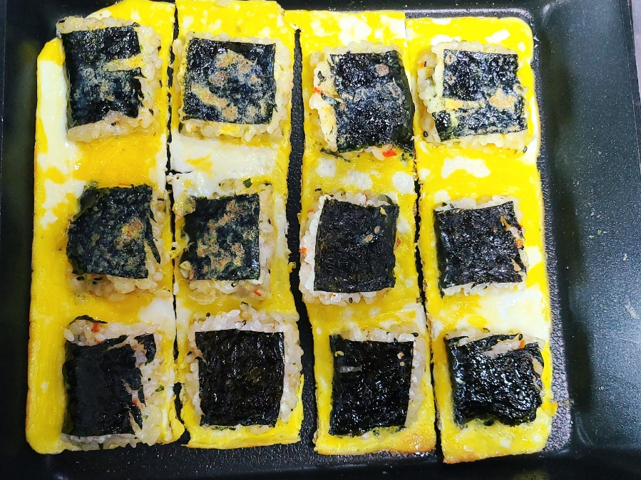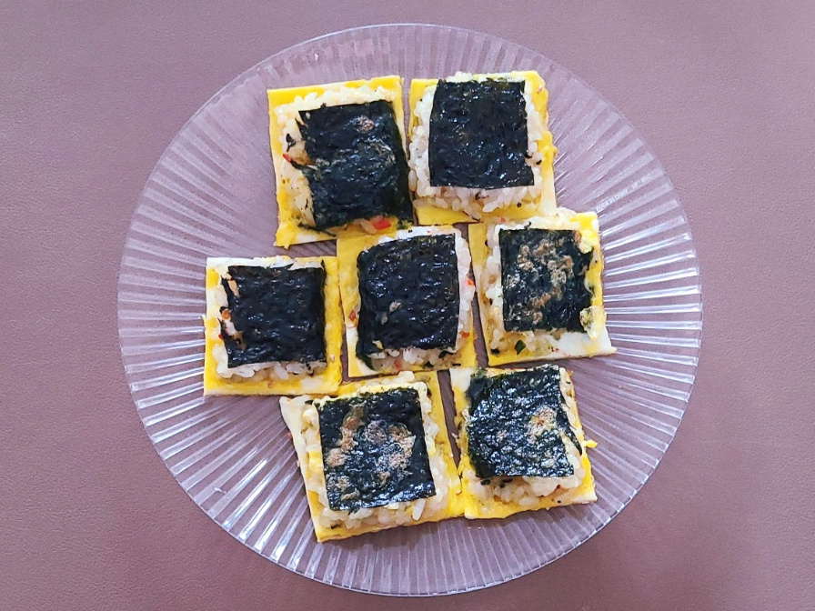 팬에서 꺼낸 다음에 살짝 식힌 후 밥전 크기대로 계란을 자른 다음에 정리를 하면 찬밥요리 계란 김 밥전 만들기 완성입니다.