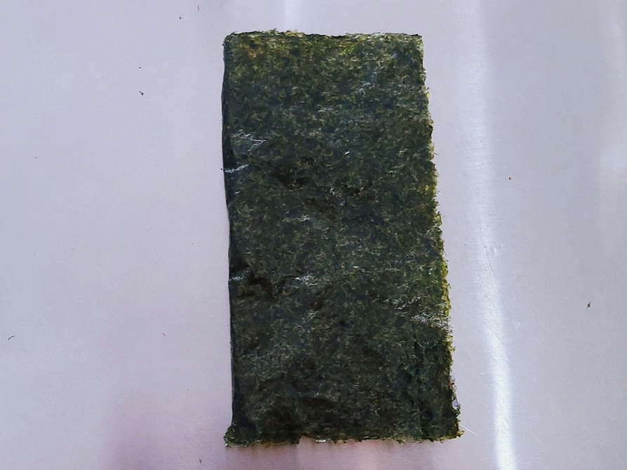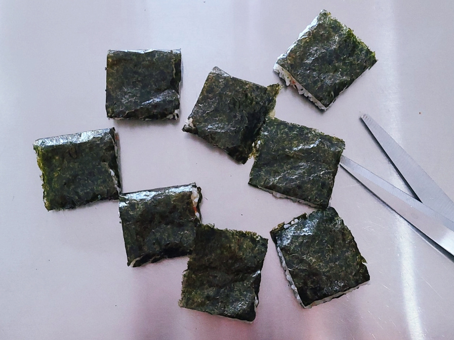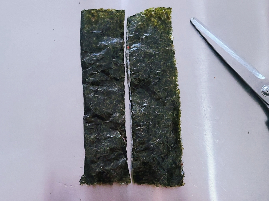 밥이 없는 김 반대편을 접어서 밥과 함께 붙힌 다음에 가위로 길게 반(2등분)으로 잘라줍니다.