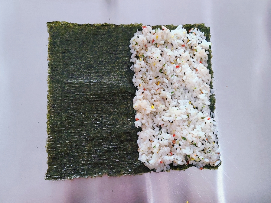 김밥 김 까칠한 부분이 도마 위로 올린 다음에 한 쪽에 밥을 올려서 고르게 펴 준 다음에
