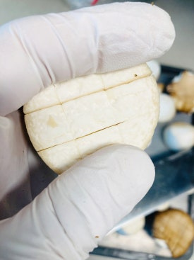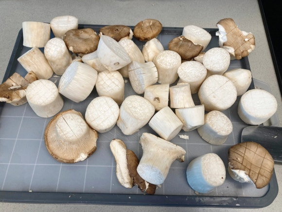 준비된 새송이버섯을 이렇게 통으로 잘라주시고 단면에 양념이 잘 스며들게 칼집을 내어주세요.