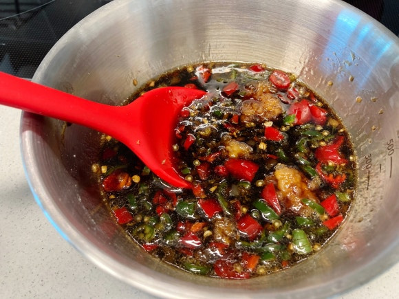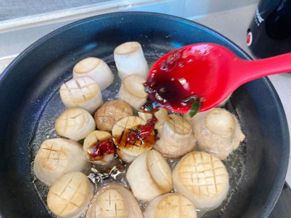버섯 주위로 기포가 하나둘 올라오게 되면 버섯을 뒤집어주시고 양념을 구워진 면에 뿌리면서 조금씩 졸여주세요.