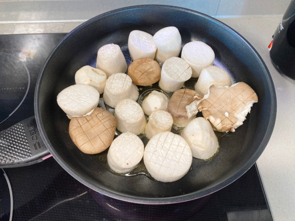 기름이 달궈진 팬에 버섯 투하. 그리고 '약'불로 천천히 버섯을 익혀주세요