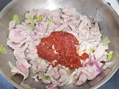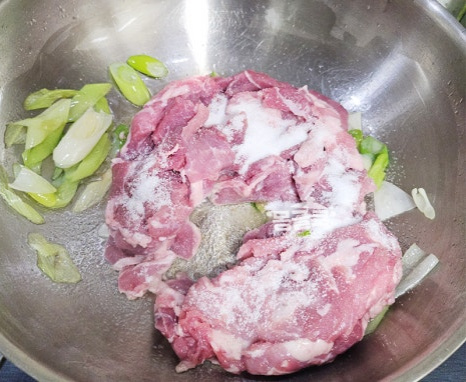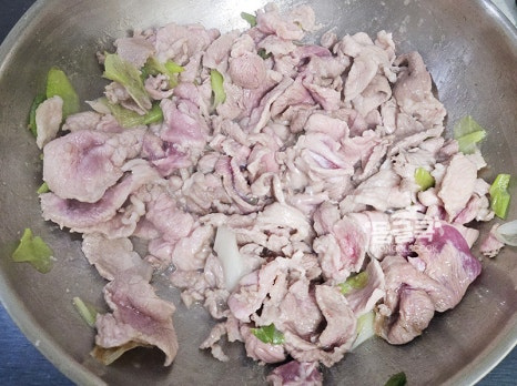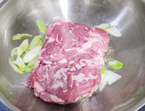 파 기름이 우러나면 불을 강불로 올려 돼지고기를 넣어주세요.