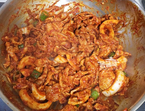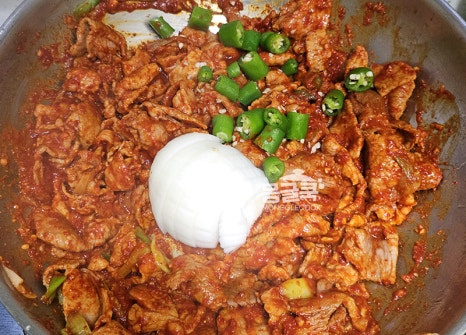 이때 양파와 청양고추도 함께 넣어 중불에서 고기에 양념이 충분히 배도록 볶아주세요.