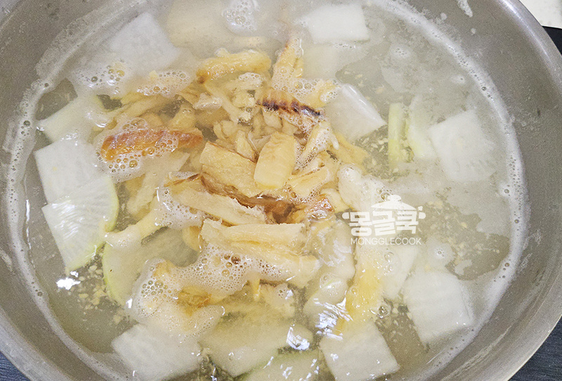 건져둔 황태채를 넣어 국물에 자연스럽게 풀어지도록 5분간 끓여주세요.