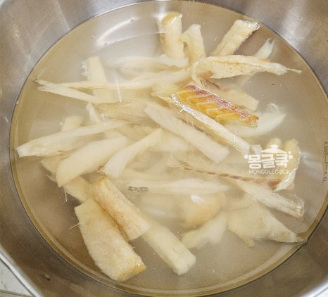 우려낸 뒤 건져낸 황태채는 먹기 좋은 크기로 찢어 준비해 주세요.