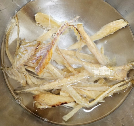 물 800ml에 황태채를 넣고 20~30분 실온에서 담가 우려내주세요.