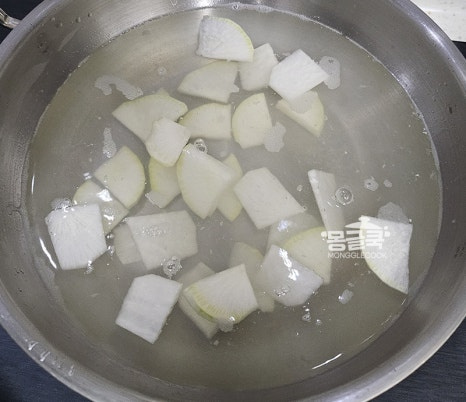 썰어 둔 무를 넣어 센 불에서 끓여주세요.