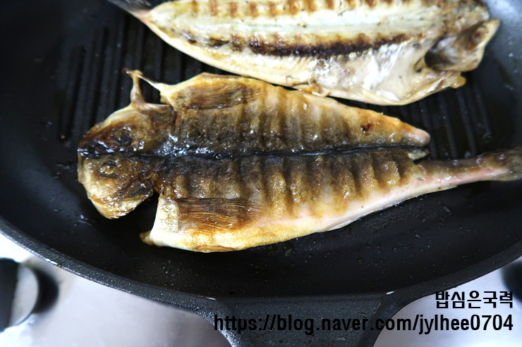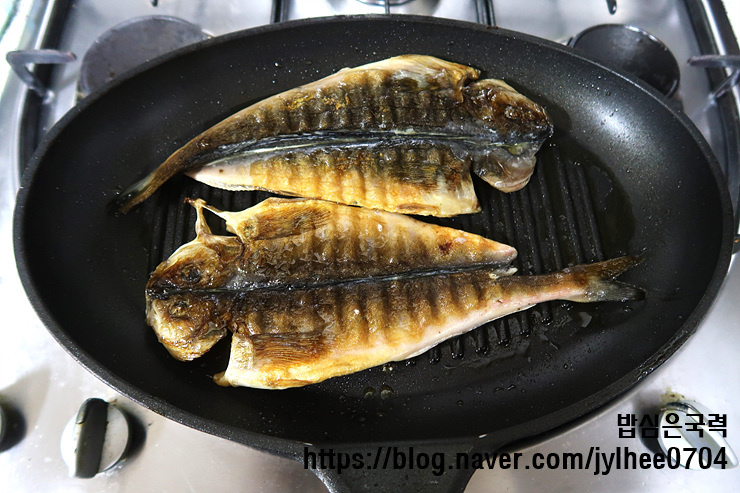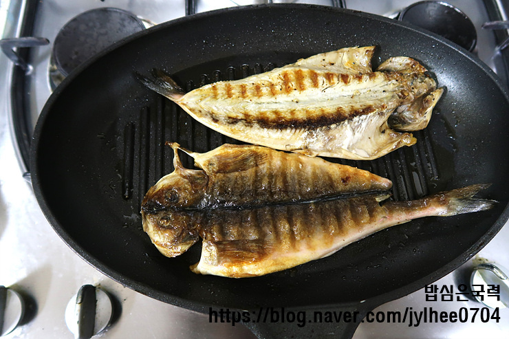 앞뒤로 노릇하게, 특히 꼬리 쪽은 살짝 눌러주면 바삭함이 좋아요.