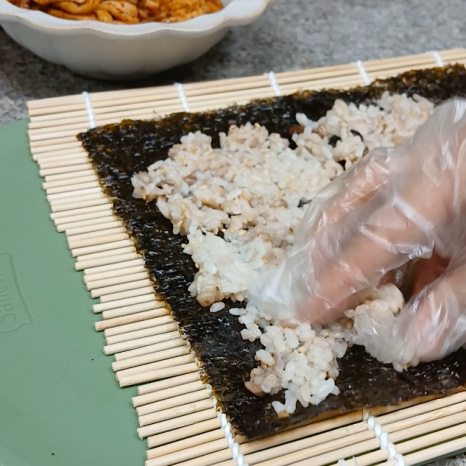 충분히 식힌 밥을 김위에 골고루 깔아주세요. 밥이 뜨거우면 김이 눅눅해져서 찢어질 수 있어요