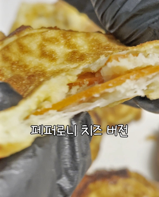 처음 반죽을 부을 때는 많이 넣지 말고 속재료가 들어갈 만큼만 얇게 깔아주세요.