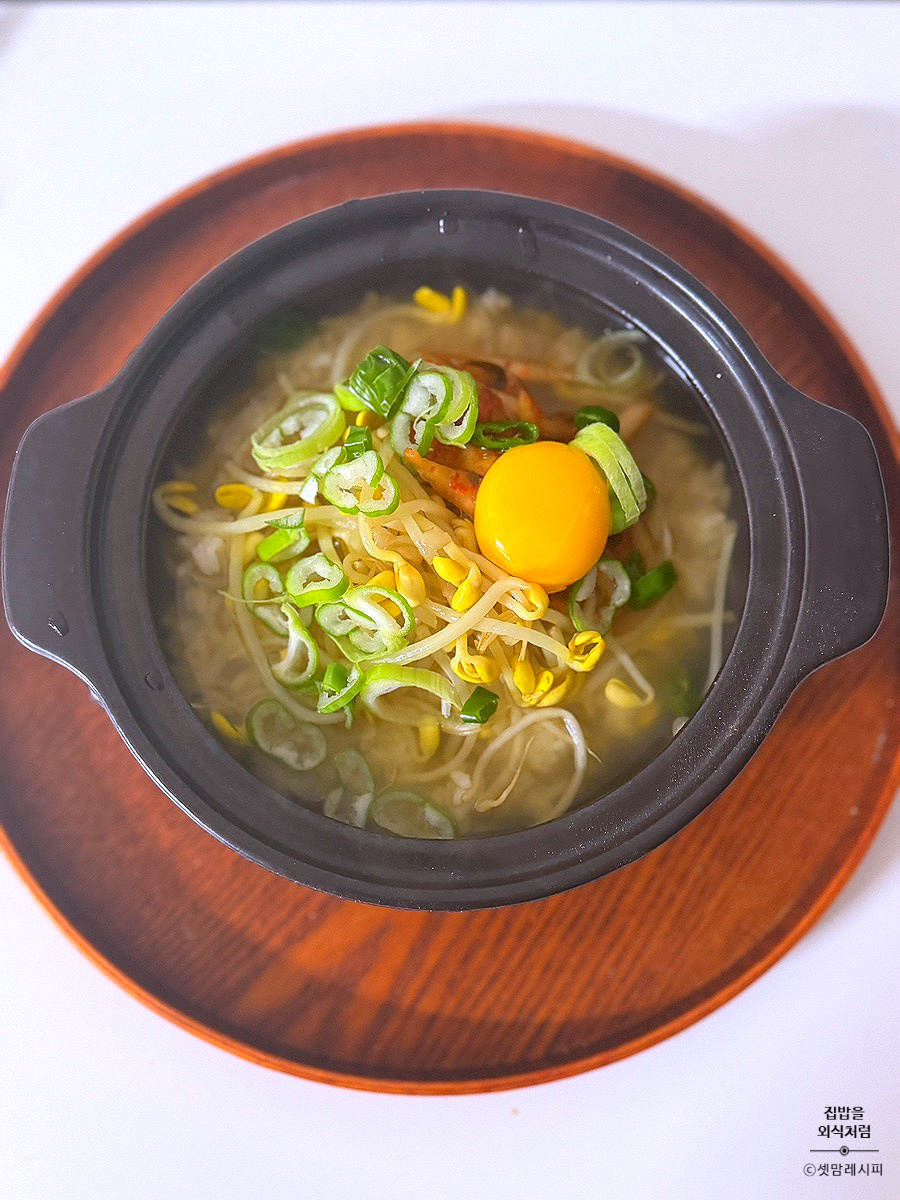뚝배기에 밥담고 국물 콩나물 김치 담아요.다진 대파, 다진 청양고추를 올려주세요.