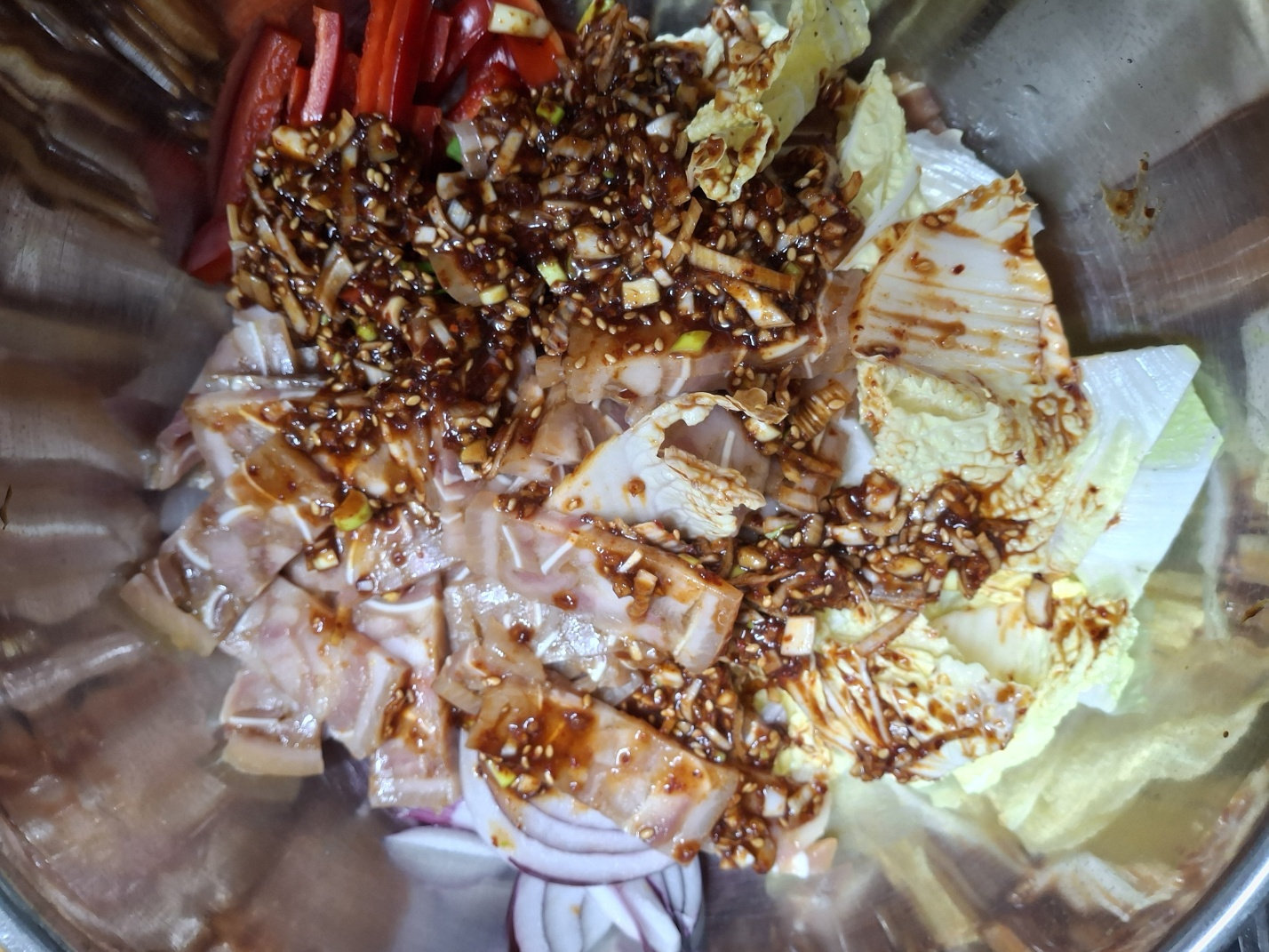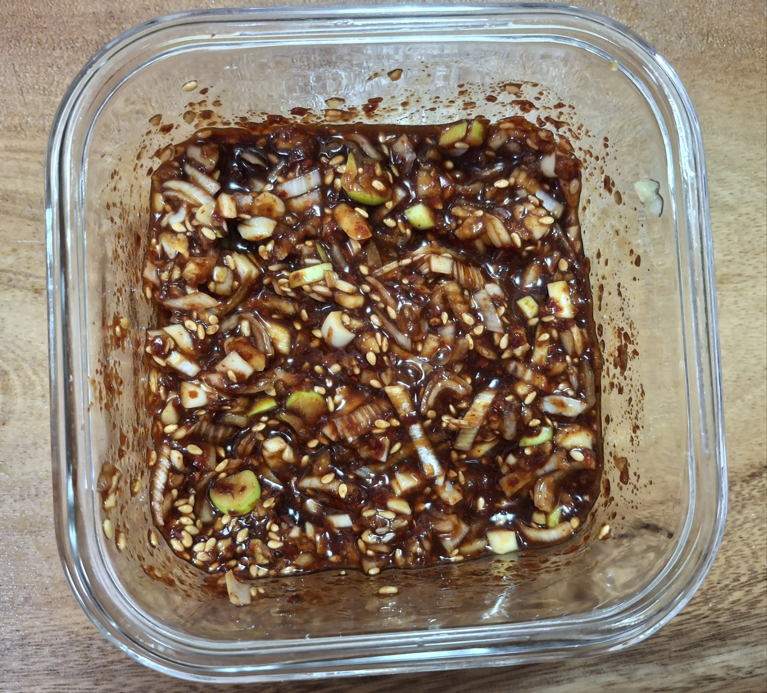 다진 마늘 1큰술, 다진 대파 2큰술, 고춧가루 1큰술, 간장 2큰술, 매실액 1큰술, 설탕 1큰술, 식초 1큰술