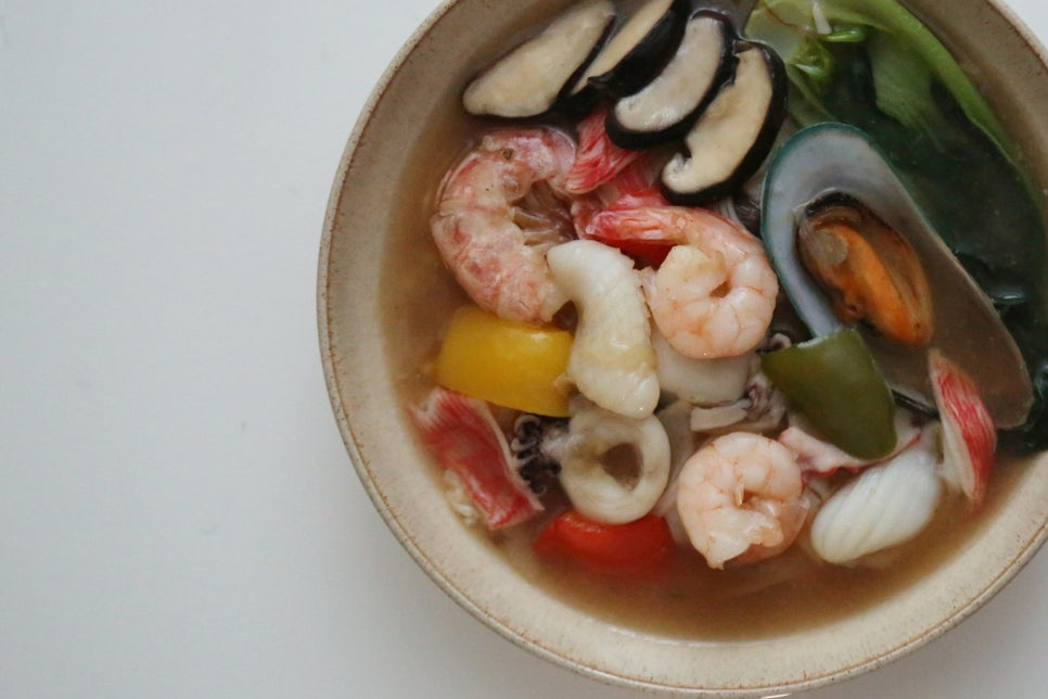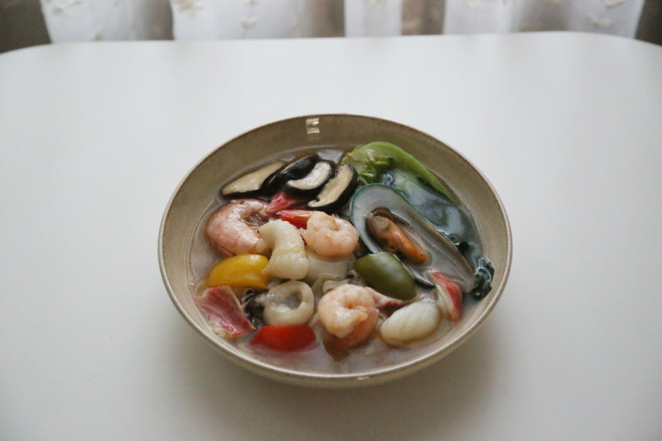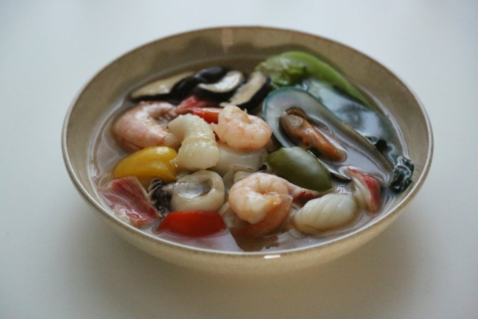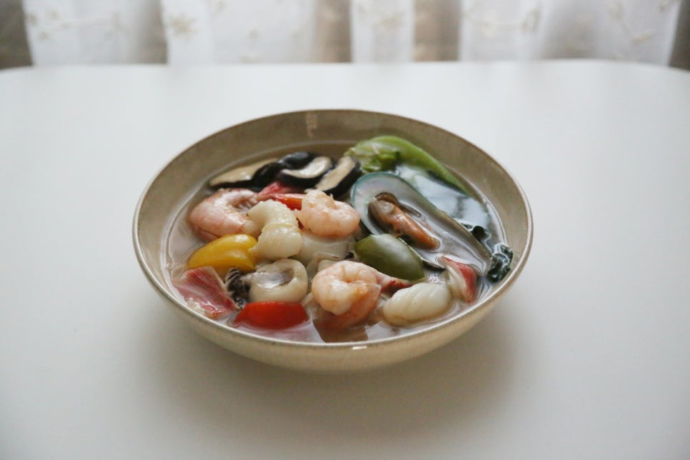 청경채 2뿌리, 양파 1/2개, 송고버섯 4개, 피망 1개, 파프리카(노랑, 빨강) 각 1/2개, 대파(흰부분) 1/2대, 해물모둠 700g