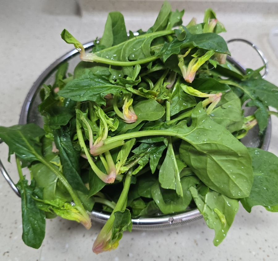 시금치 뿌리 끝부분은 칼로 살짝 다듬어주되 붉은색 뿌리는 영양소가 많으니 완전히 자르지 않고 살려두는 것이 좋아요.