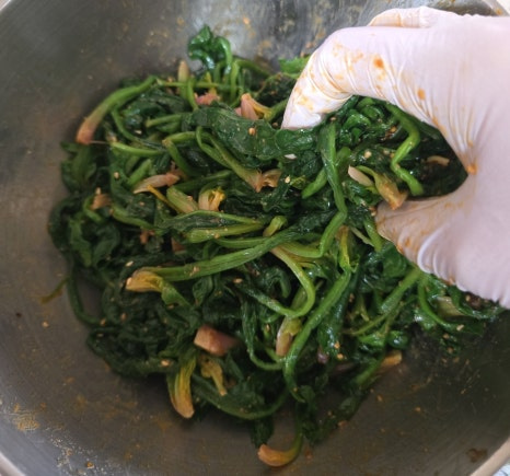 찬물에 헹군 시금치의 물기를 두 손으로 꽉 짜서 제거해 주세요.