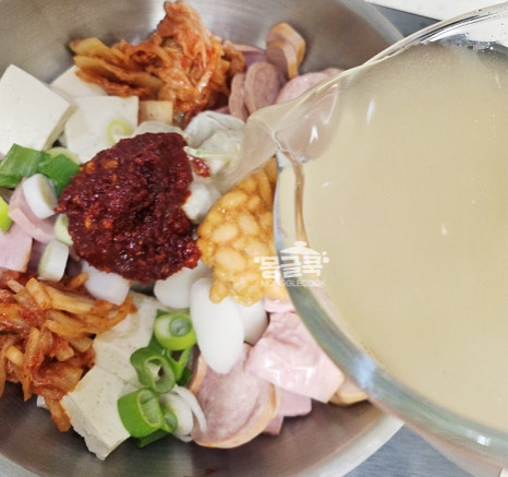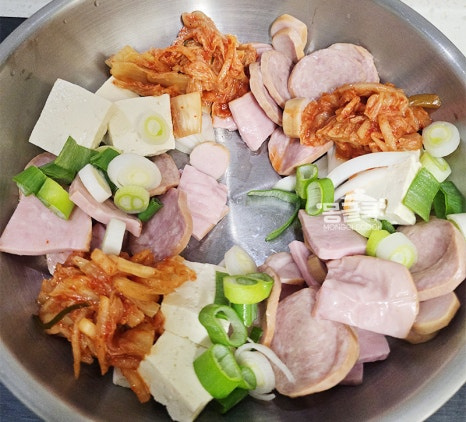 전골냄비나 깊은 냄비에 준비한 햄, 소시지, 김치, 양파, 두부, 떡국떡 등을 돌려 담아주세요.