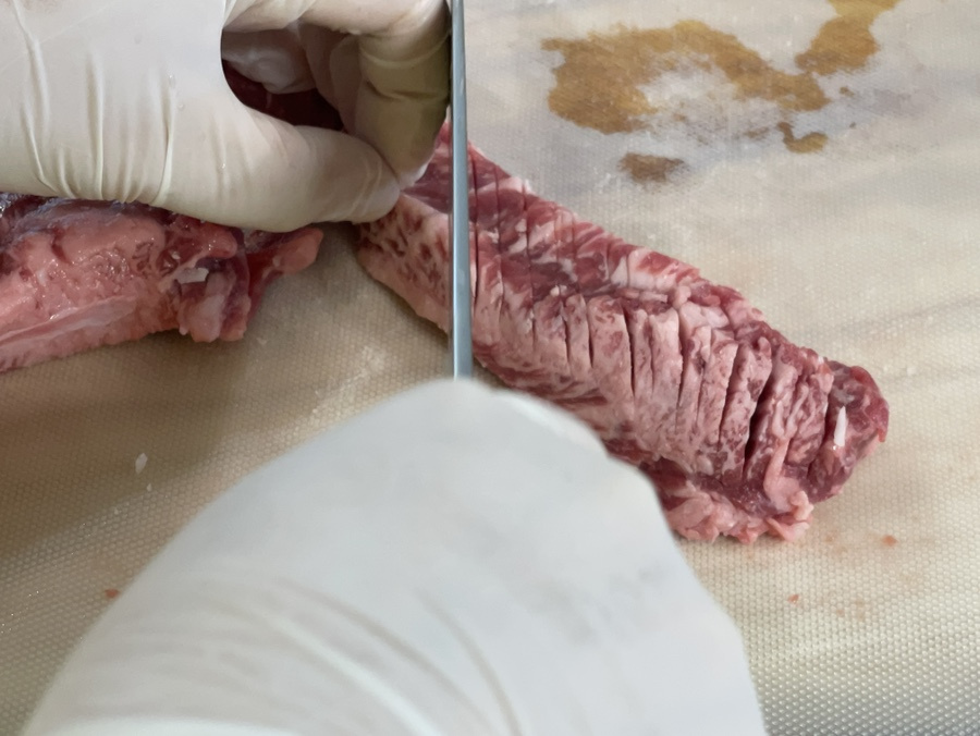 근막과 지방을 제거한 갈빗살은 양념이 잘 스며들 수 있도록 칼집을 넣어 주세요.