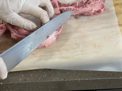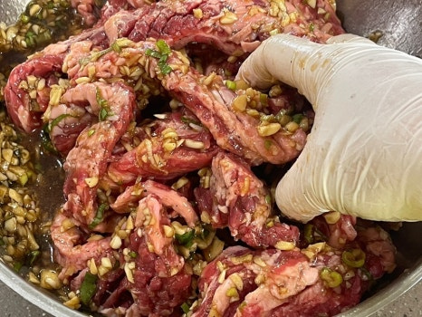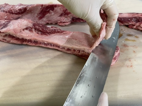 갈빗살 겉에 붙어 있는 근막을 제거해 주면서 지방이 두껍게 붙어 있는 쪽은 가위나 칼로 제거해 주세요.