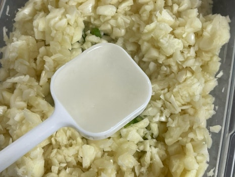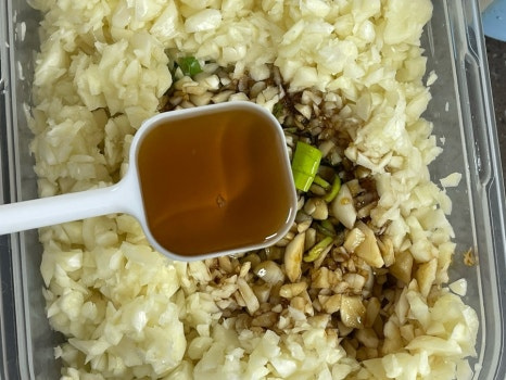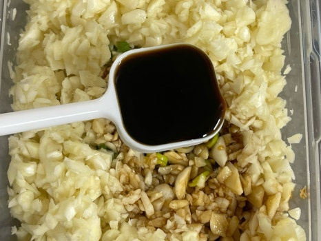 볼에 대파1대, 마늘350g, 배음료3T, 진간장4T, 참치액1T, 미림3T, 매실액2T, 물엿1T, 마스코바도2T, 순후추, 미원1tsp을 넣고 섞어 주세요.