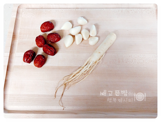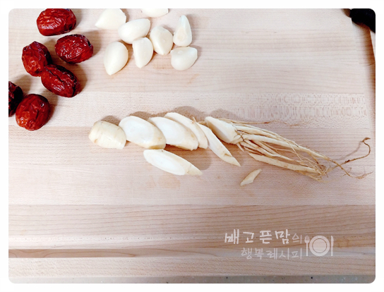 대추 6 개, 미늘 8 쪽, 수삼 한 뿌리를 준비해 줍니다.