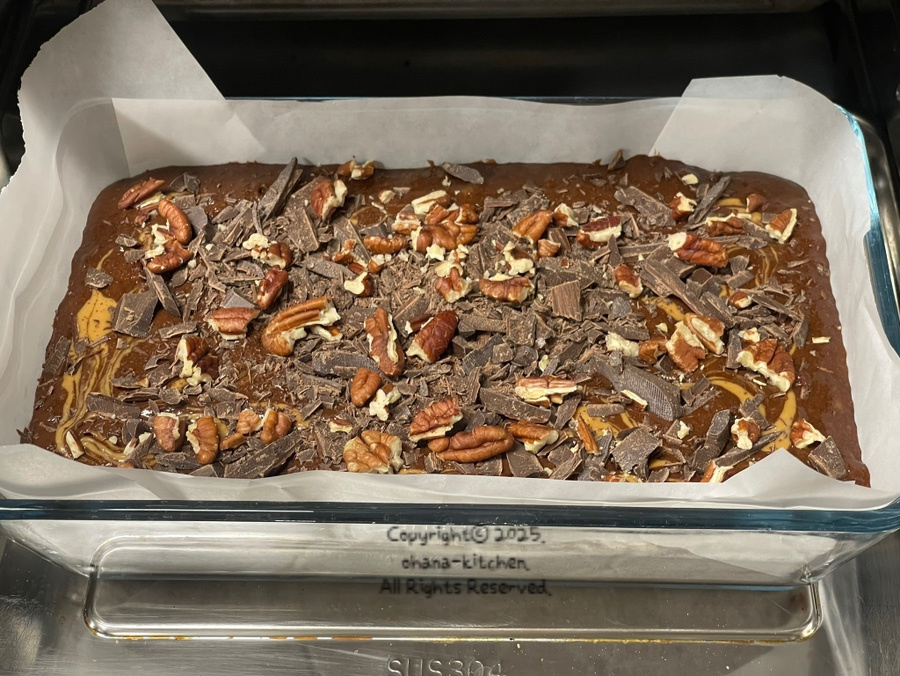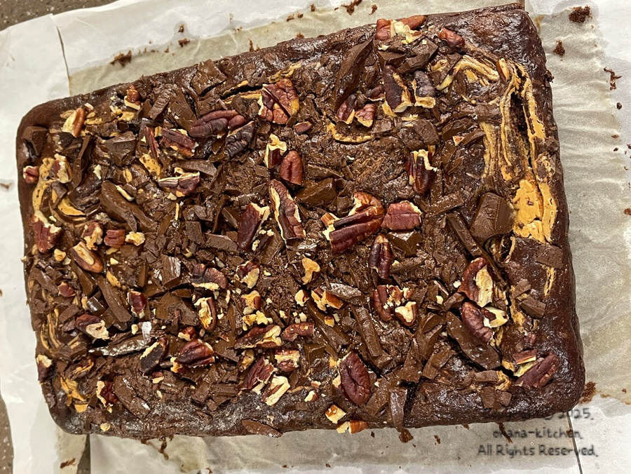 잘 익은 바나나 4 개 , 계란 4 개 , 마스코바도 설탕 60 g , 소금 2 g , 땅콩버터 100 g , 코스트코 프로마쥬블랑치즈 50 g , 바닐라에센스 1 tsp , 코코아파우더 50 g , 아몬드가루 70 g , 베이킹소다 4 g , 시나몬파우더 4 g , 다크초콜릿 140 g (100g반죽+40g토핑용), 토핑용 땅콩버터 30 g , 피칸 60 g