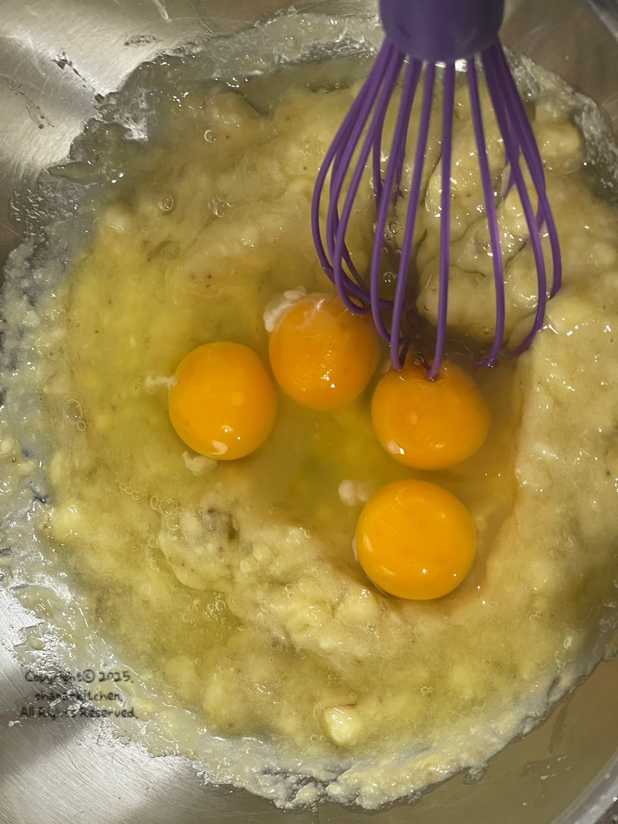 계란은 실온에 한 시간 정도 빼서 찬기를 뺀 뒤 바나나와 함께 섞어 주세요.