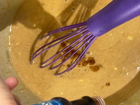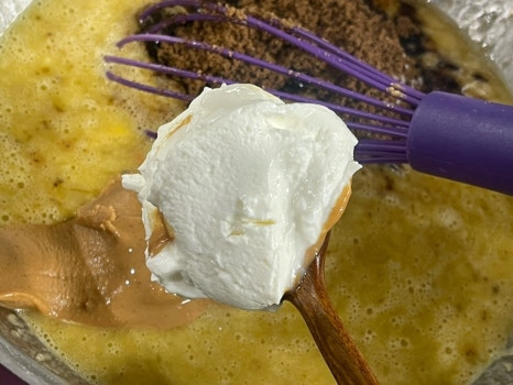 바나나와 계란을 섞은 반죽에 마스코바도 설탕60g, 소금2g, 땅콩버터100g, 코스트코 프로마쥬블랑치즈50g, 바닐라에센스1tsp를 넣어 준 뒤 뭉친 부분 없도록 잘 섞어 주세요.