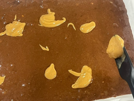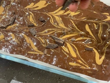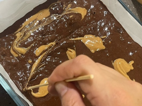 토핑용 땅콩버터 30g을 조금씩 띄엄띄엄 올려 꼬챙이로 지그재그 모양을 내준 뒤 남은 토핑용 다크초코, 피칸을 올려 마무리해 주세요.