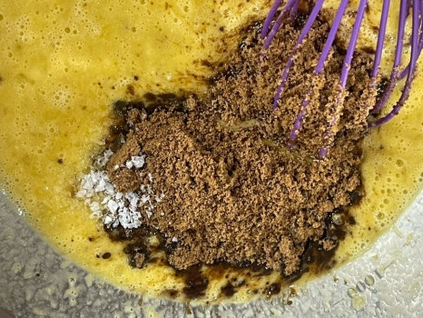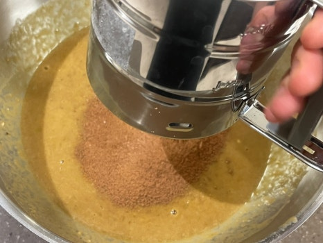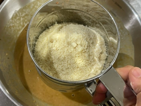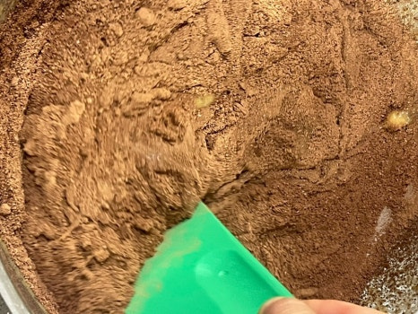 여기에 코코아파우더50g, 아몬드가루70g, 베이킹소다4g, 시나몬파우더 4g를 채쳐서 넣어 준 뒤 주걱으로 가루가 보이지 않을 만큼만 섞어 주세요.