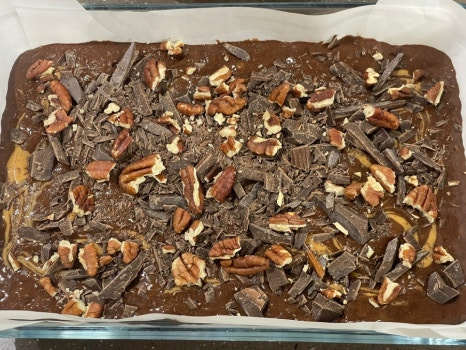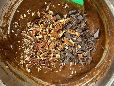 여기에 잘게 썬 다크초콜렛 100g과 잘게 부순 피칸 60g 중 40g정도만 넣고 섞어 준 뒤 유산지를 깐 틀에 반죽을 넣어 준 뒤 바닥에 두세 번 쳐서 기포를 빼주세요.