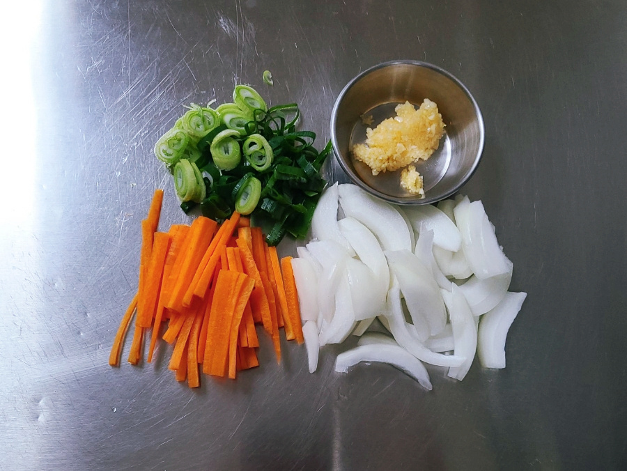 채 썬 당근, 양파, 다진마늘을 모두 넣고