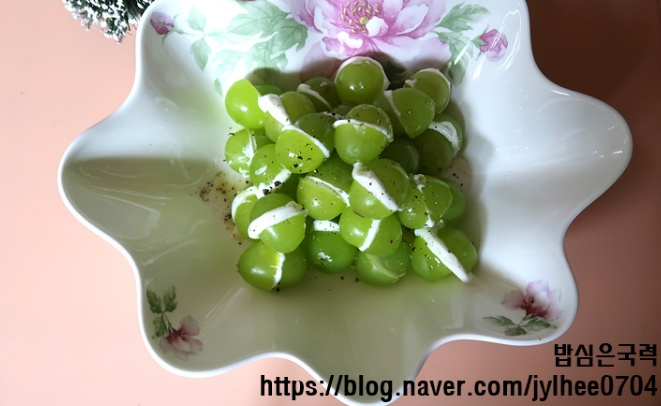 안녕하세요? 밥심은 국력입니다. 초록빛이 통통한 샤인머스켓에 부드 러운 그릭요거트를 샌드하듯 끼워 넣어 만든 아주 간단한 크리스마스 디저트예요. 만들기도 쉽고 플레이팅도 예뻐서 손님상이나 가족들과의 특별한 날 에 딱입니다. 올리브오일과 통후추를 살짝 뿌려 주면 달콤·고소·상큼함이 동시에 살아나는 매력 만점 한입 디저트 가 완성돼요.